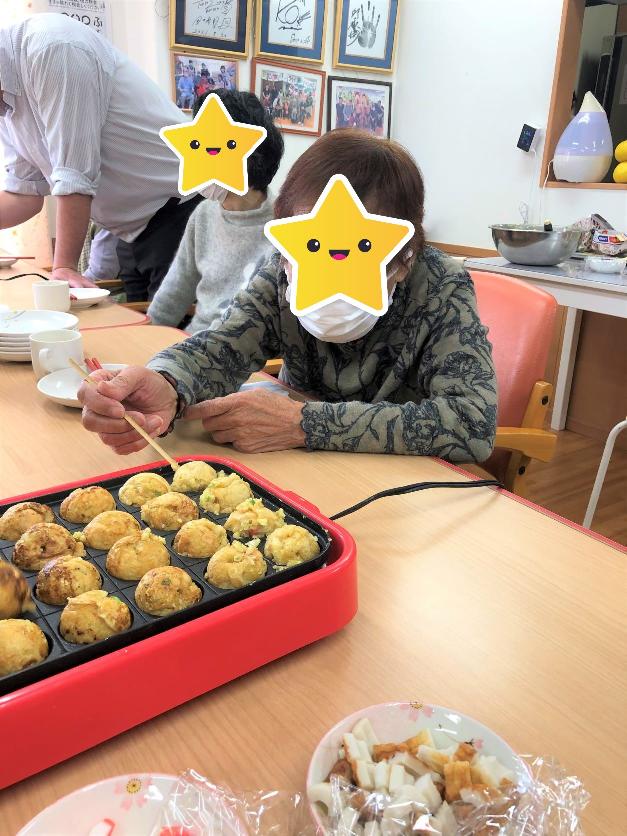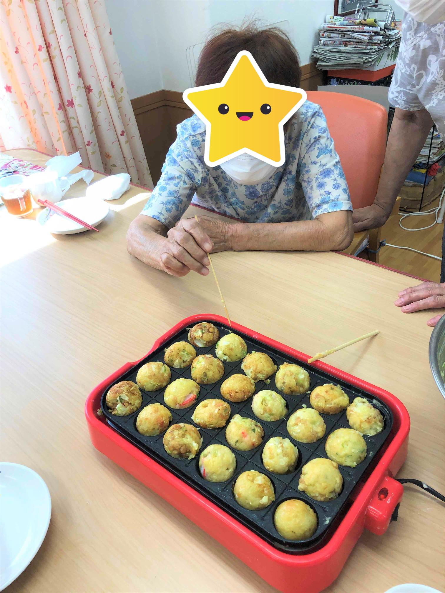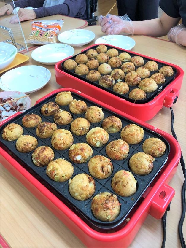 職員と利用者様と一緒にたこ焼きをコロコロ、まん丸に出来上がりました。