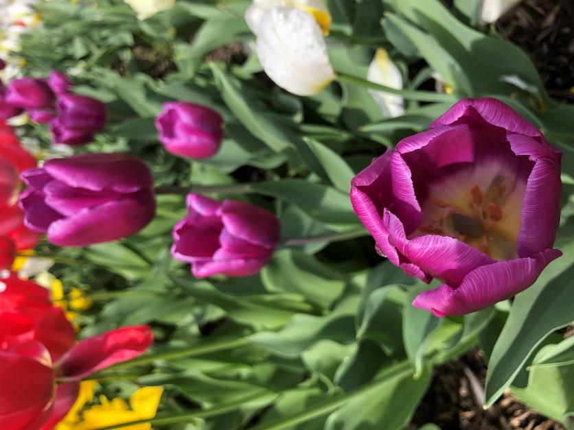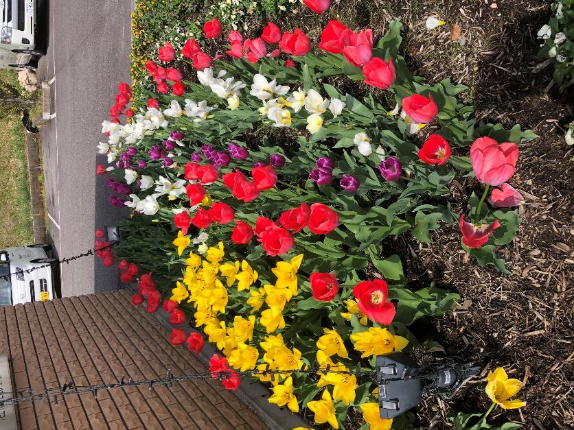令和5年4月10日、玄関前のチューリップが満開になりました。今年は春の訪れが早く、例年より早く咲きました。その他に、パンジーやムスカリもとても綺麗です。